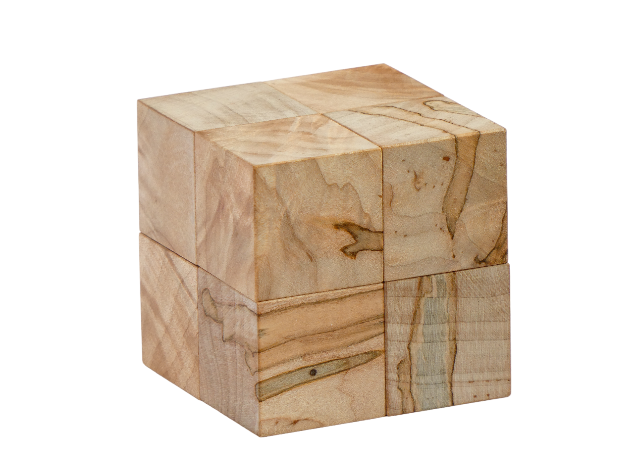 Eight cubes combine into one larger cube, snapping together with magnets in a satisfying way. Beautiful design with great fidgeting potential. Made of Ambrosia Maple, each copy has a unique spalting pattern. All parts are carved from single pieces of wood without glue or joinery.